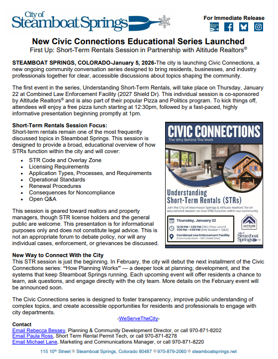 Steamboat Springs is launching a new Civic Connections public forum series with an opening session focused on short-term rentals, aimed at helping residents better understand how STR regulations work.