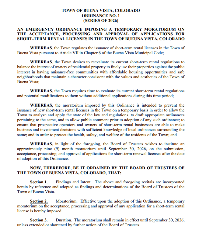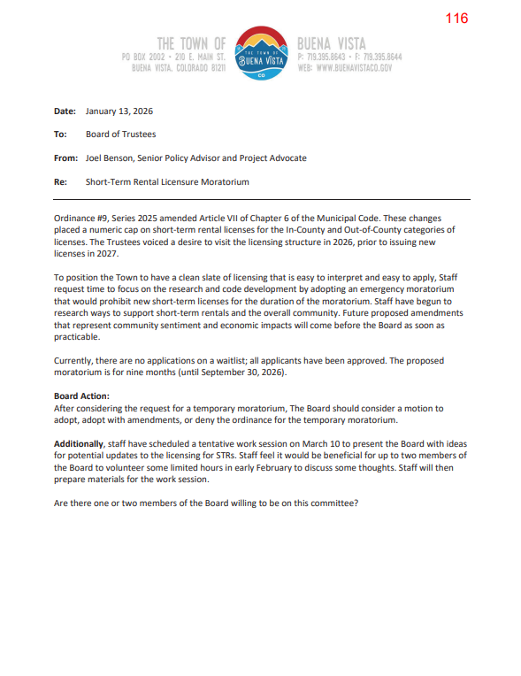 Several trustees emphasized that there is no clear data showing stricter STR rules improve housing affordability and warned against unintended impacts on downtown vibrancy. Town officials said the moratorium allows time for stakeholder input, data review, and policy refinement, with an initial work session tentatively scheduled for March 10. The moratorium runs through September 2026 but may be lifted earlier.