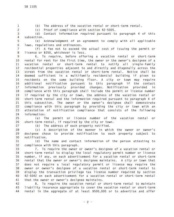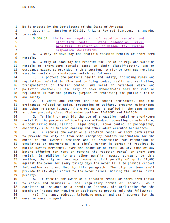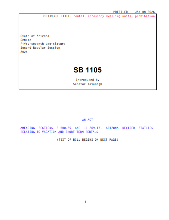 Arizona Senate Majority Leader John Kavanagh has pre-filed Senate Bill 1105, which would allow cities and counties to prohibit accessory dwelling units from being used as short-term or vacation rentals.
