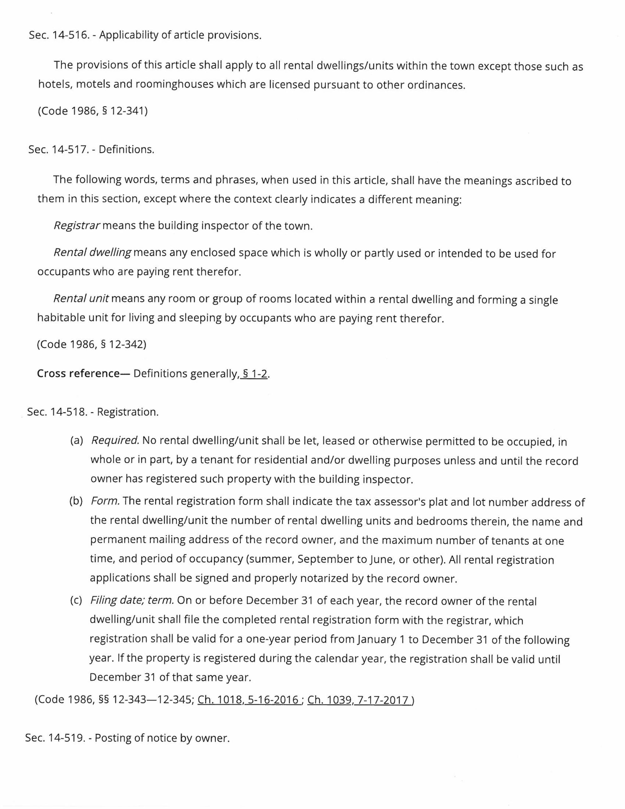 Until the litigation is resolved, rental properties must register under the town’s existing ordinance (Sections 14-518 to 14-520), requiring owners to complete registration with the Building Inspector before renting to tenants. The registration period has been extended until February 24, 2025, with a $120 per-unit fee due by that date. Owners who have not yet registered are urged to do so within the next 30 days.