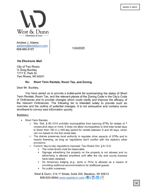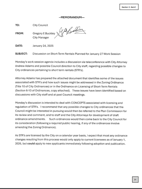The City of Two Rivers is considering changes to its short-term rental regulations focusing on occupancy limits and transparency for residents about licensed properties. During a January 27th work session, the council explored updates with City Attorney Andrew Adams discussing topics like license revocation criteria and outdoor lighting standards.