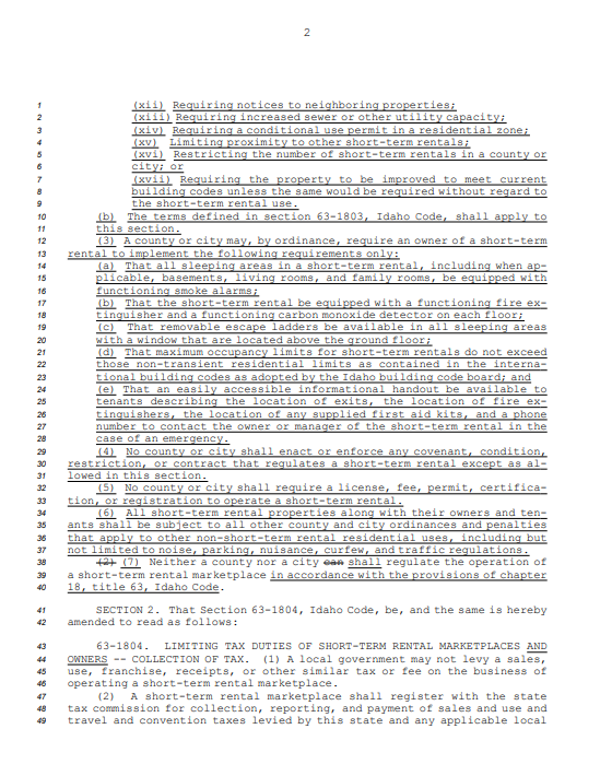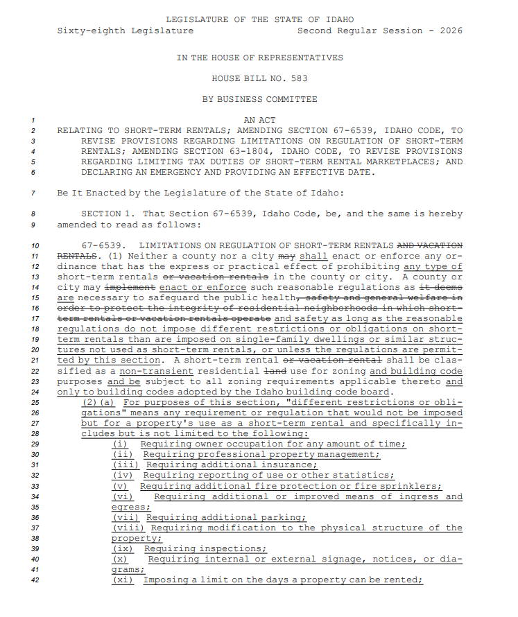 Idaho short-term rental owners moved closer to statewide regulatory relief as the House approved House Bill 583, limiting local governments’ authority over STRs and allowing only minimal safety and occupancy rules while prohibiting licensing, registration, or STR-specific fees.
