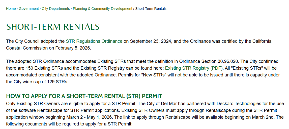 The City Council in Del Mar approved new short-term rental permit fees of $815 for an initial two-year license and $598 for renewals as part of implementing its first comprehensive STR ordinance, which caps eligibility at 129 properties while allowing 150 existing rentals to continue operating until they phase out.