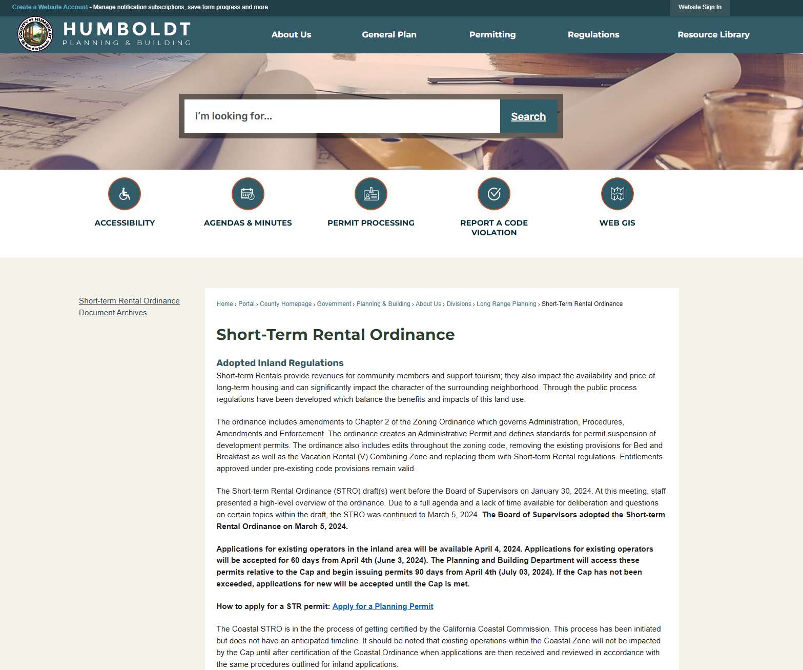 Humboldt County is adjusting its short-term rental (STR) ordinance through an adaptive management approach, granting special permits and amending regulations.