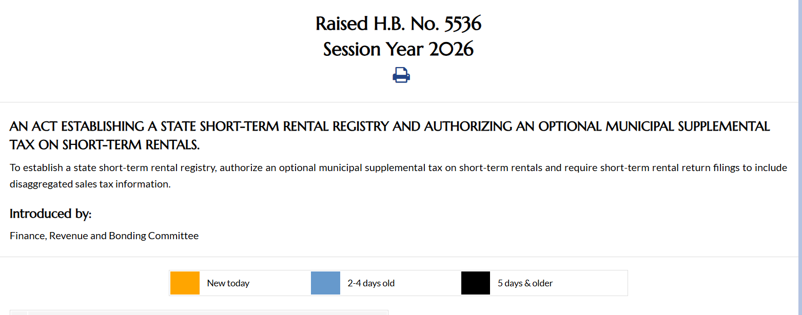 Connecticut lawmakers are considering House Bill 5536, which would establish a statewide short-term rental registry and allow municipalities to impose an additional local tax of up to 2.75%.