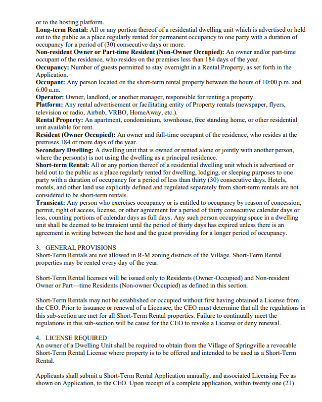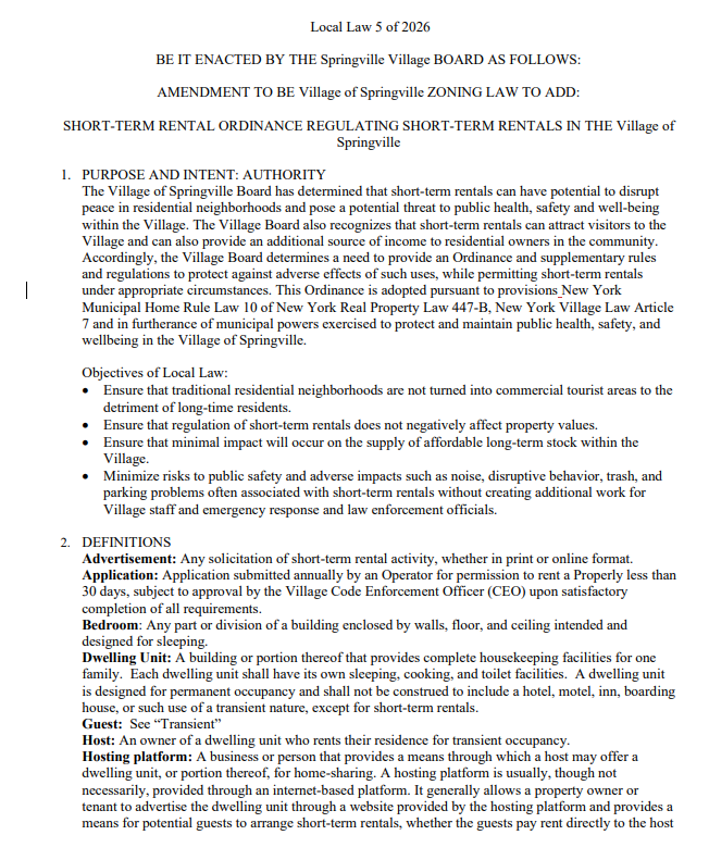 The Village of Springville has approved Local Law 5 of 2026, establishing a regulatory framework for short-term rentals following a public hearing on March 16.