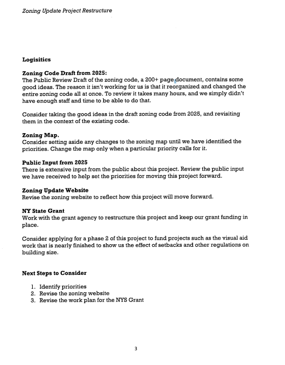 Planning Director Heather Lanza outlined the restructured approach at the Town Board's April 21 work session, noting that the departure of outside consultant ZoneCo made a comprehensive all at once update impractical. Town Supervisor Al Krupski pointed to the ongoing work on short term rental code as evidence that the incremental strategy is already in motion, with a full list of priorities expected to be established in the coming weeks.