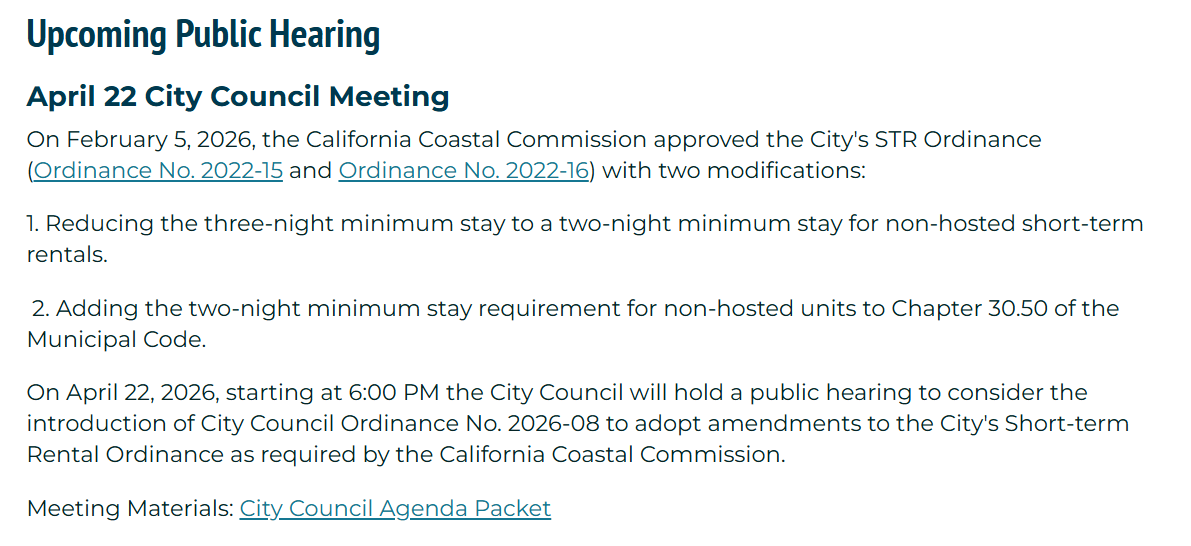 The council's decision means the city forfeits the ability to cap total vacation rental units and enforce a 200-foot separation rule between non-owner-occupied properties, tools that two council members argued were worth the trade-off. The city currently has 319 permitted short term rental units, with an estimated 200 additional properties operating without permits and avoiding the city's transient occupancy tax, which Encinitas plans to crack down on in the coming months.