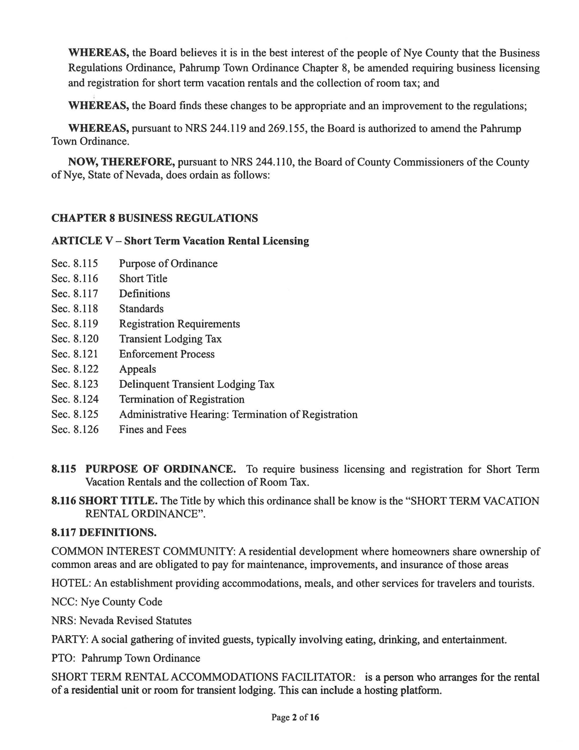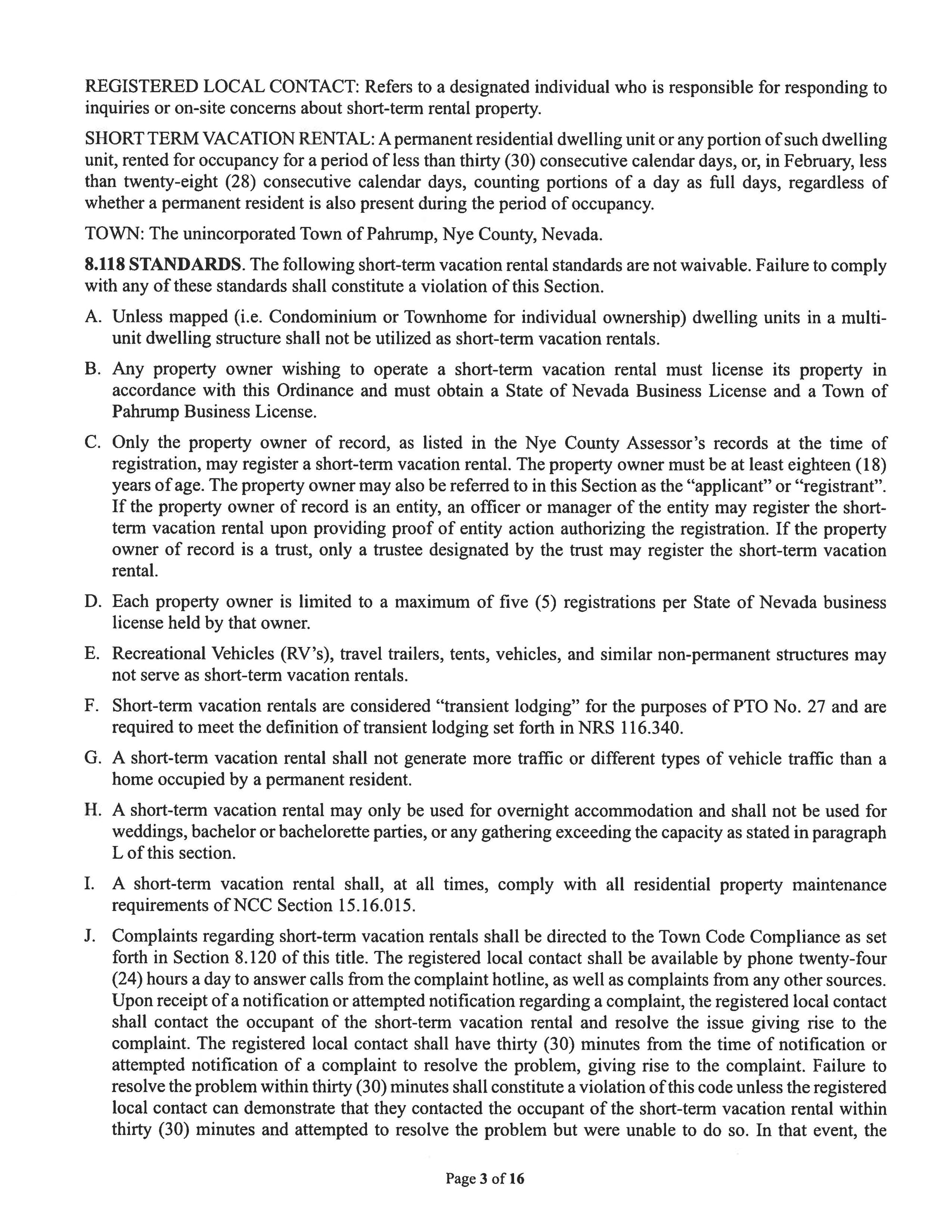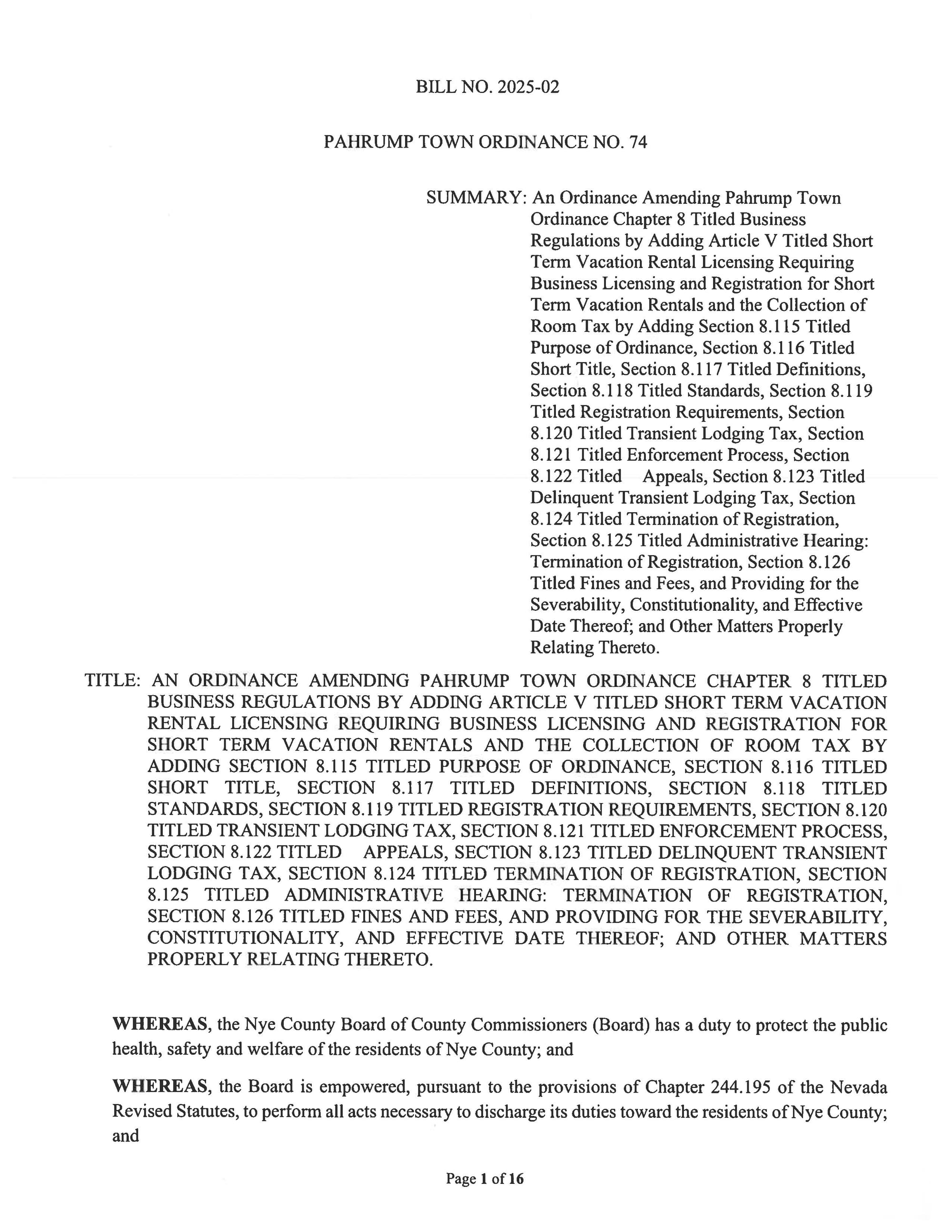 Pahrump’s new short-term rental licensing rules are now in effect, following the Nye County Board of Commissioners’ July 15 adoption of Ordinance No. 74 under Chapter 8.115 Article V of the Town Code.