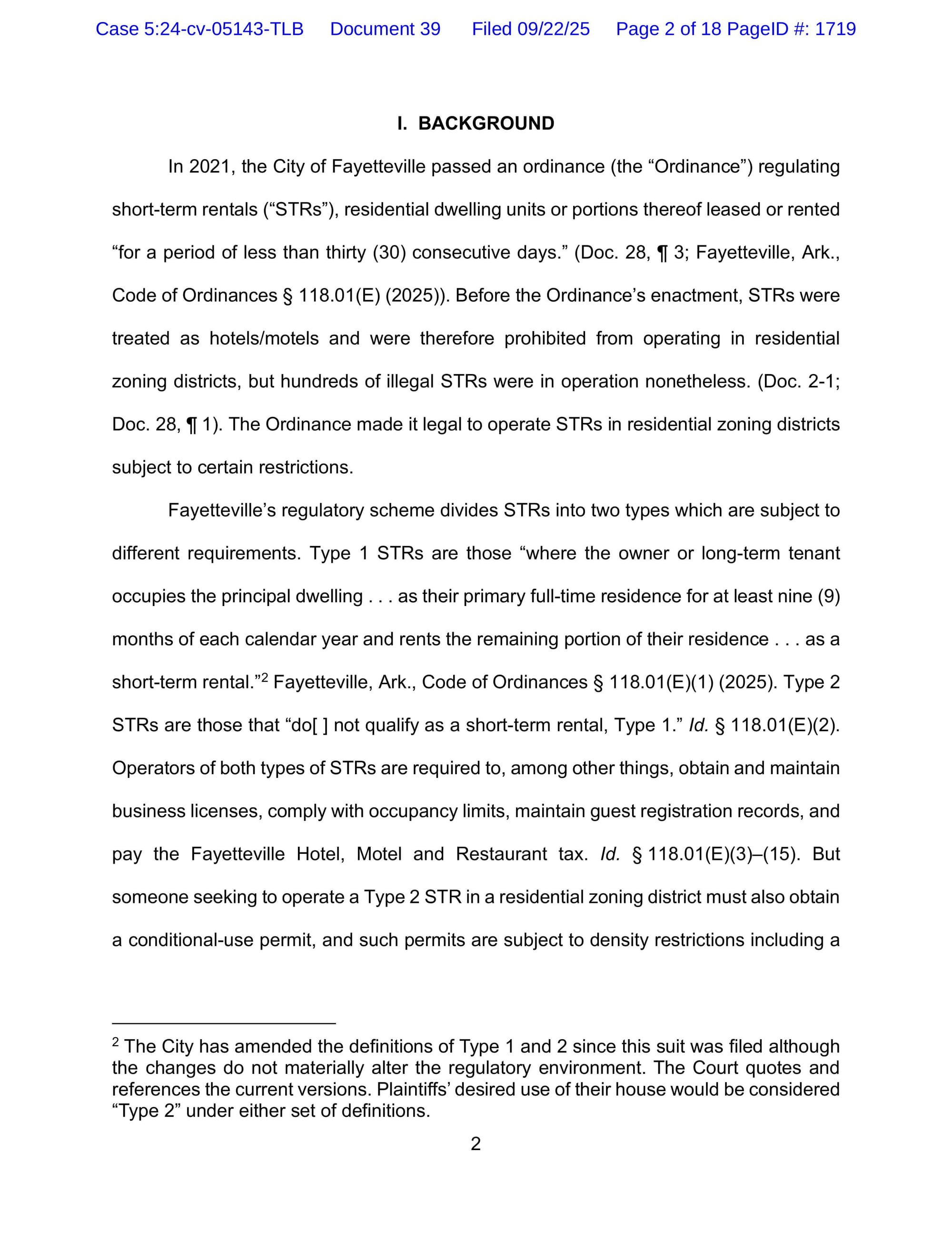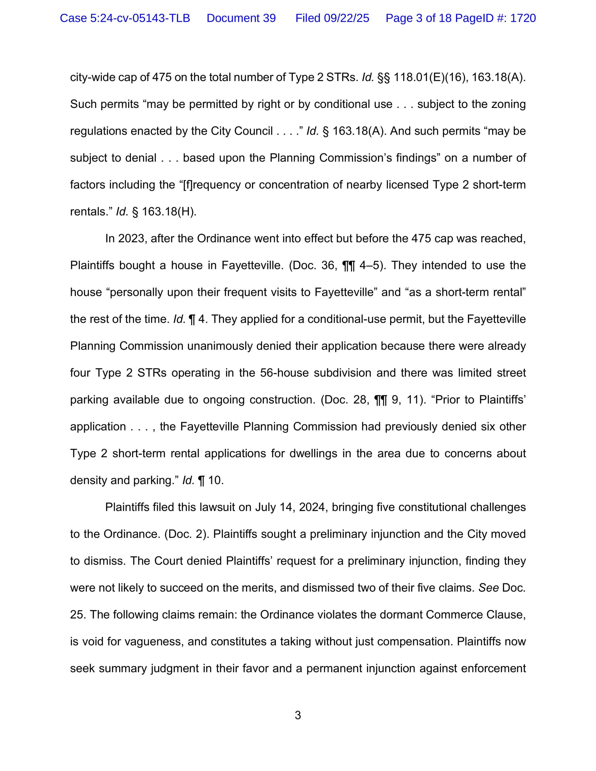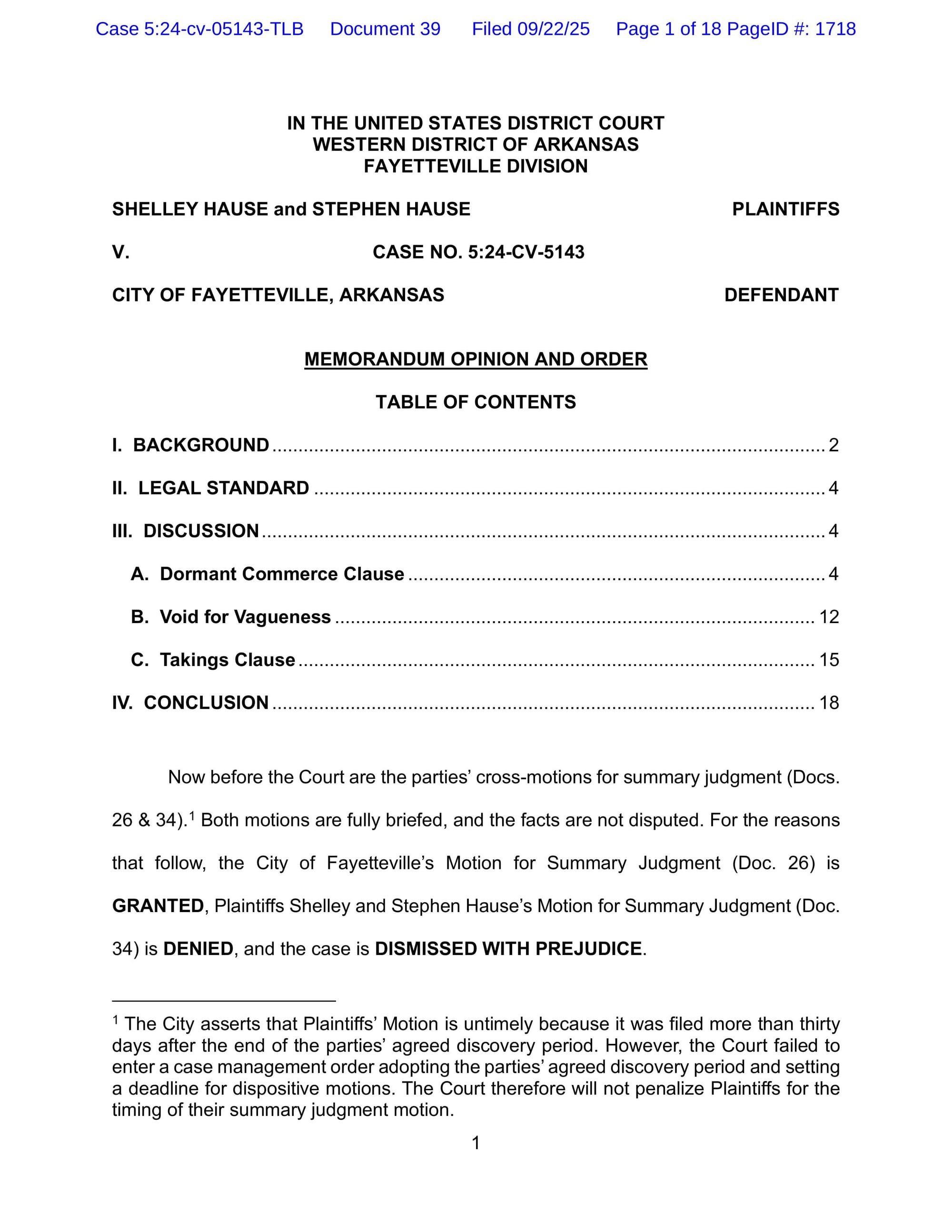 The case, filed by a Texas couple after their Type II rental application was denied, argued the ordinance violated the Dormant Commerce Clause, was unconstitutionally vague. U.S. District Judge Timothy Brooks rejected each claim, noting the rules were clearly defined, not discriminatory, and did not deprive the owners of property rights. The decision leaves the city’s 2021 short-term rental regulations intact as the couple’s parallel case continues before the Arkansas Supreme Court.