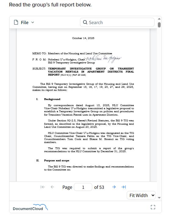 The group’s report, presented to the County Council’s Housing and Land Use Committee, calls for rezoning dozens of high-value or coastal properties to allow both short- and long-term rentals. The group—chaired by Councilmember Nohelani Uʻu-Hodgins—said the move would minimize economic disruption and provide legal clarity where hotel-type uses already exist. But advocates for wildfire survivors and local residents objected that the exemptions could remove thousands of homes in Lahaina from potential long-term use.