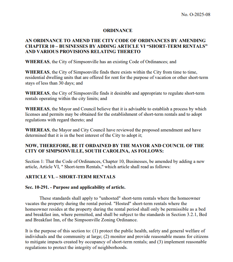 Simpsonville has approved its first comprehensive short-term rental ordinance, setting clear rules on where rentals can operate and who can run them.