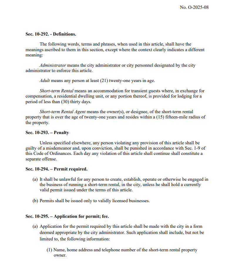 The new law, adopted October 14, requires owners to secure a city permit, designate a local rental agent within 15 miles, and limit guest stays to 30 consecutive days instead of the previous six months. Current operators have 120 days to comply before facing a $250 application fee. Mayor Paul Shewmaker said the measure is meant to “make it fair,” ensuring STR owners contribute business licenses and accommodations taxes like hotels.