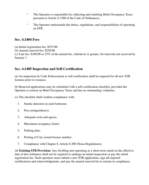 Staff recommended self-certification for initial compliance due to limited capacity but emphasized the city’s right to inspect when needed. Proposed permit fees of $525 for applications and $500 for renewals will be refined after a cost analysis of staff time and software needs. The ordinance also provides a six-month window for current operators to comply and requires posting of operating standards inside each unit.