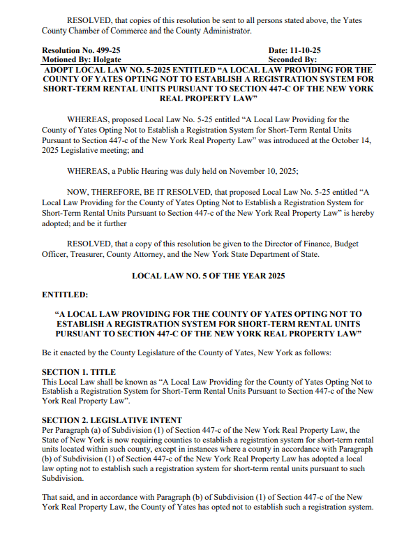 Yates County lawmakers will consider opting out of New York’s new short-term rental registration mandate during their November 10 meeting in Penn Yan.