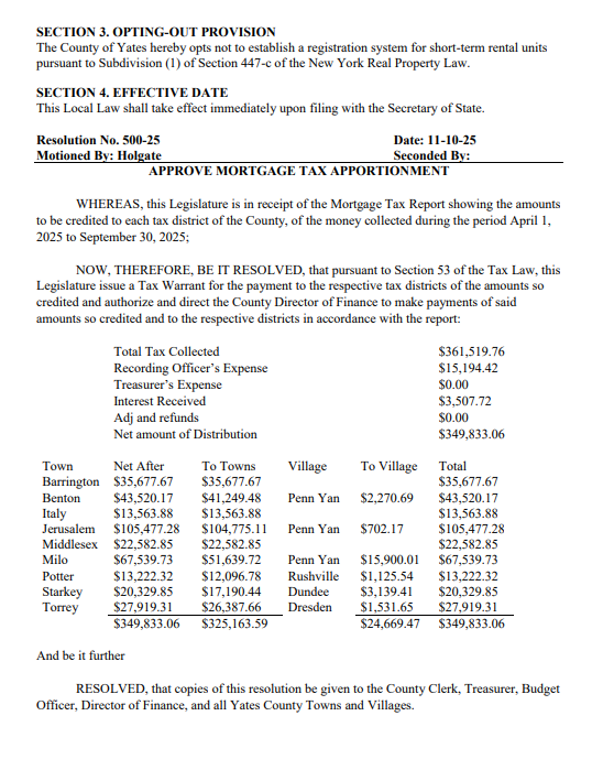 Local Law 5-25, introduced in October, would exempt the county from establishing a registration system required under Section 447-C of the state’s Real Property Law. Among them are a 911 software upgrade with RAPIDSOS and a new inmate transport contract with the Penn Yan Area Volunteer Ambulance Corps. Lawmakers are also expected to approve nearly $27,000 in tourism funding for local organizations, including the Seneca Lake Wine Trail and Dundee Area Merchants.