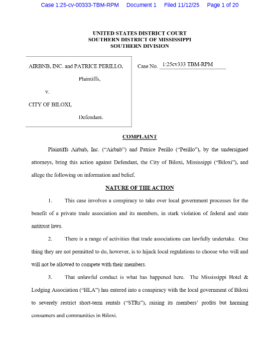 Airbnb has filed a federal lawsuit accusing Biloxi of illegally restricting short-term rentals through ordinances that ban STRs in most residential zones and cap permits at 75.