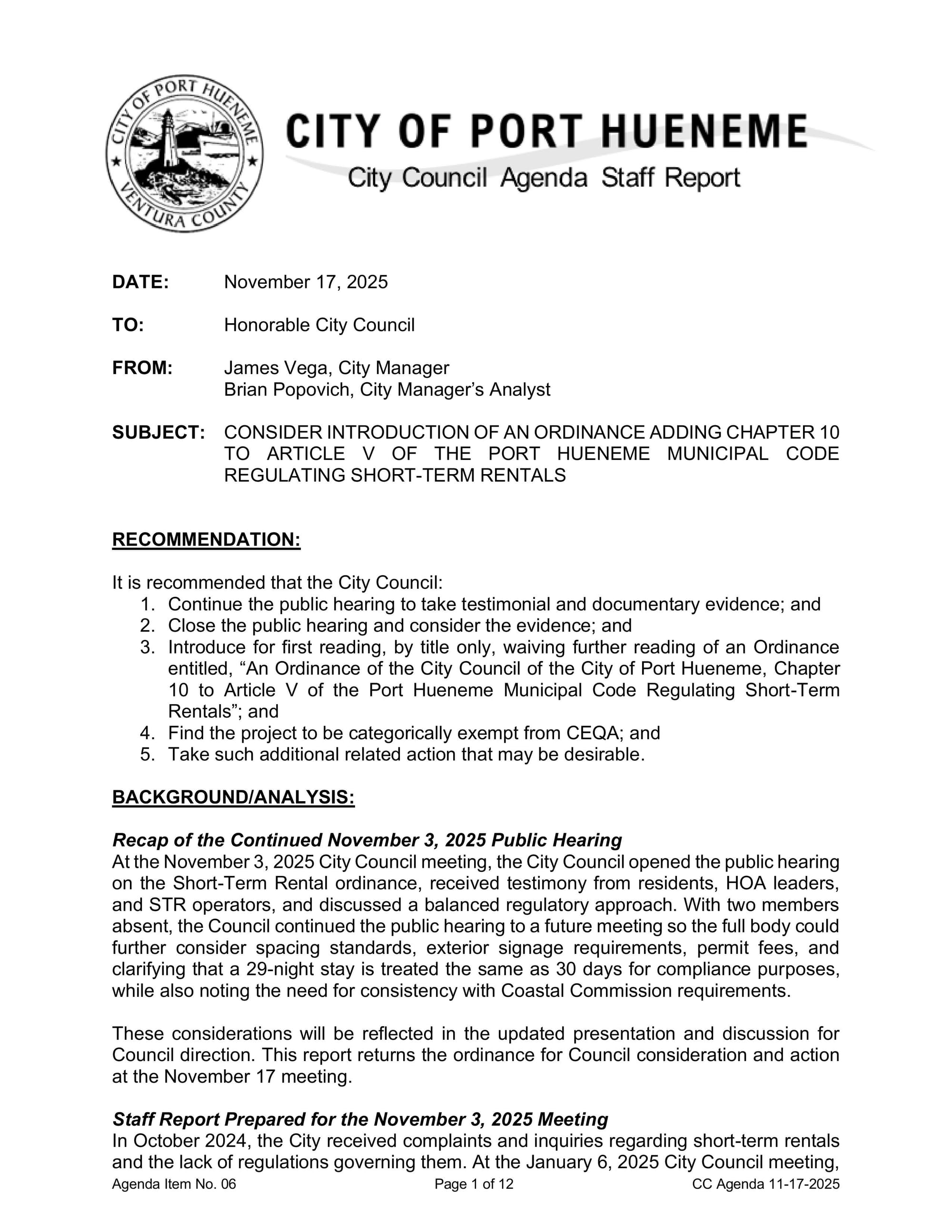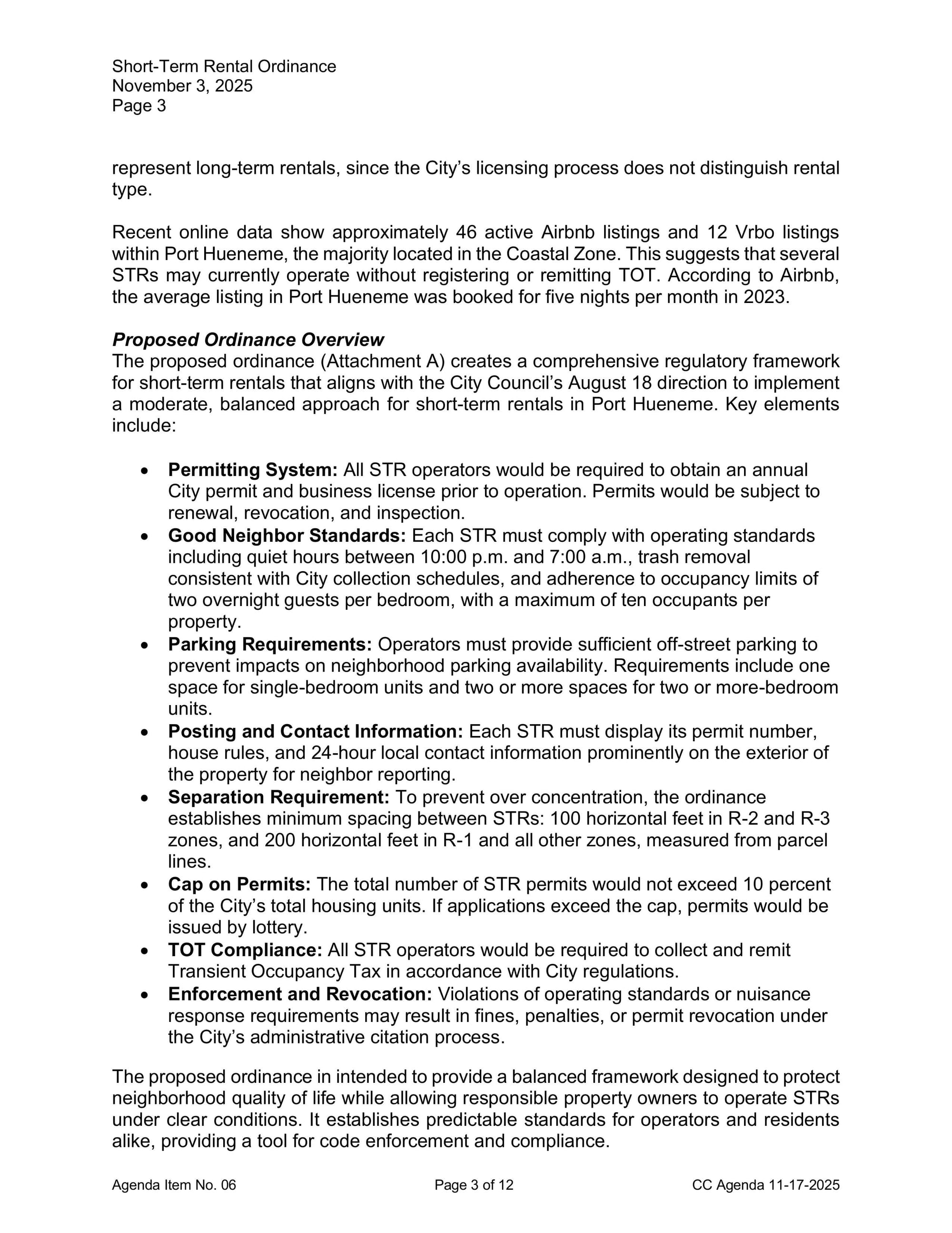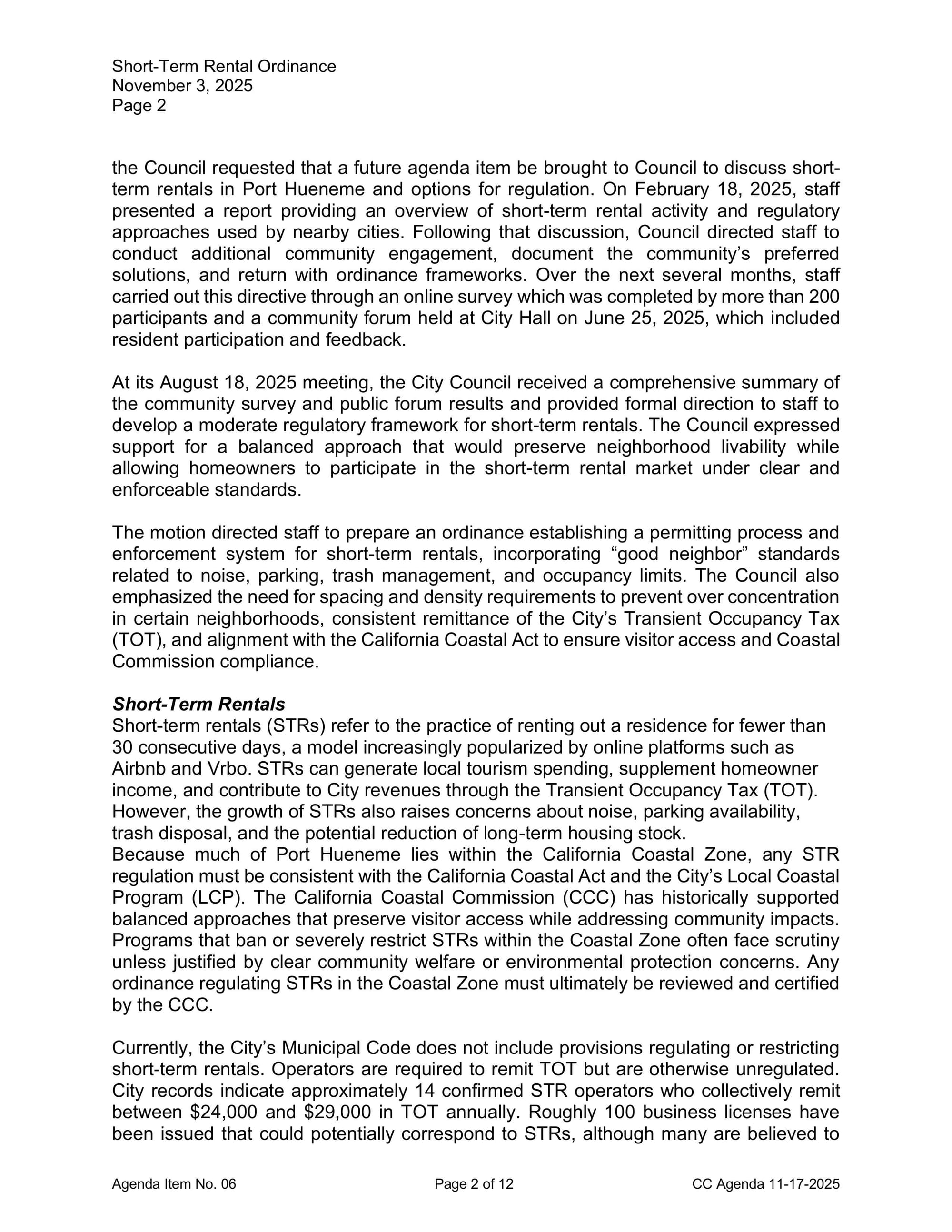 Staff said the ordinance aims to create standards for operators, including permits, quiet hours, parking rules, and enforcement tools such as permit revocation. The council approved the staff-recommended direction with two dissenting votes. Staff will return with clarified occupancy, parking, and minimum-stay language, as well as adjustments needed for properties in the Coastal Zone.