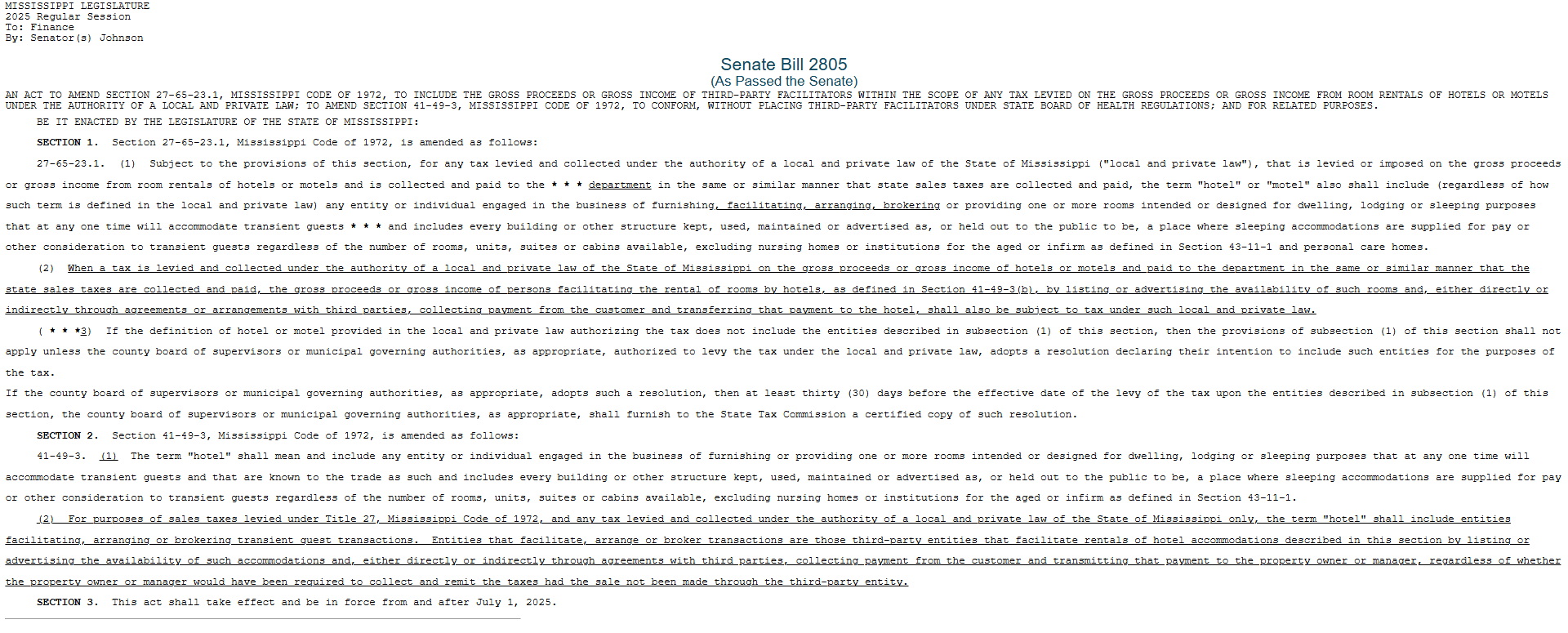 Senate Bill 2805 expands the definition of “hotel” to include booking platforms like Airbnb and VRBO. These platforms must now collect state sales tax and any local hotel taxes on total charges, including fees.