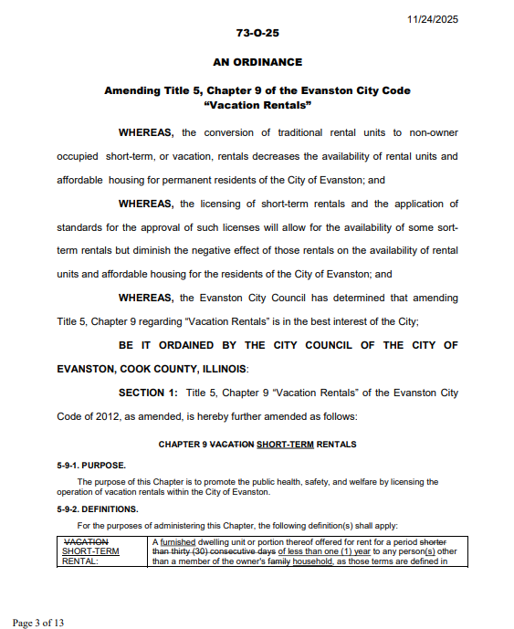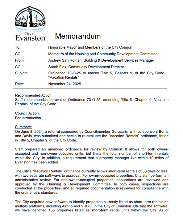 The proposed ordinance would cap vacation rentals at one for every 80 long-term rental units, allowing a maximum of about 180 citywide. It would also require property managers to live in Evanston or have an office within 10 miles. The council delayed a final vote until mid-January to allow more discussion.