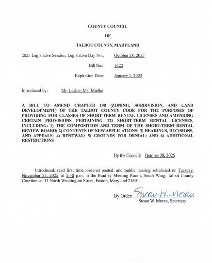 Talbot County residents and short-term rental operators clashed over proposed legislation, Bill 1622, which would impose new restrictions on rentals in village neighborhoods.