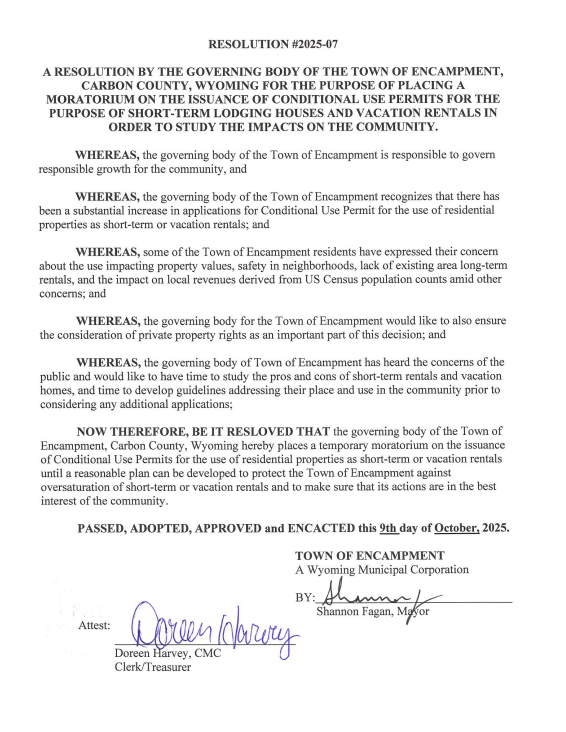 Encampment has enacted a temporary moratorium on short-term rental permits while officials study the impacts of STR growth on housing, safety, and property values.