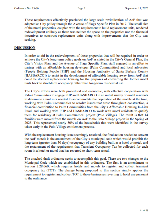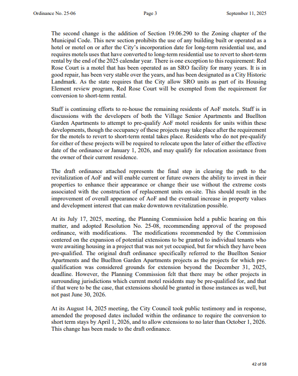 Buellton City Council has postponed action on Ordinance No. 25-06, which would remove long-term housing status from motel units along Avenue of Flags and require them to operate as short-term rentals.