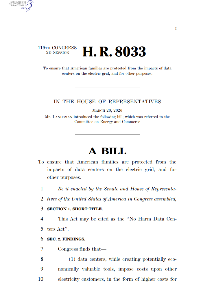 - Ohio: U.S. Rep. Greg Landsman introduces the No Harm Data Center Act, requiring operators to cover grid costs and banning official NDAs.