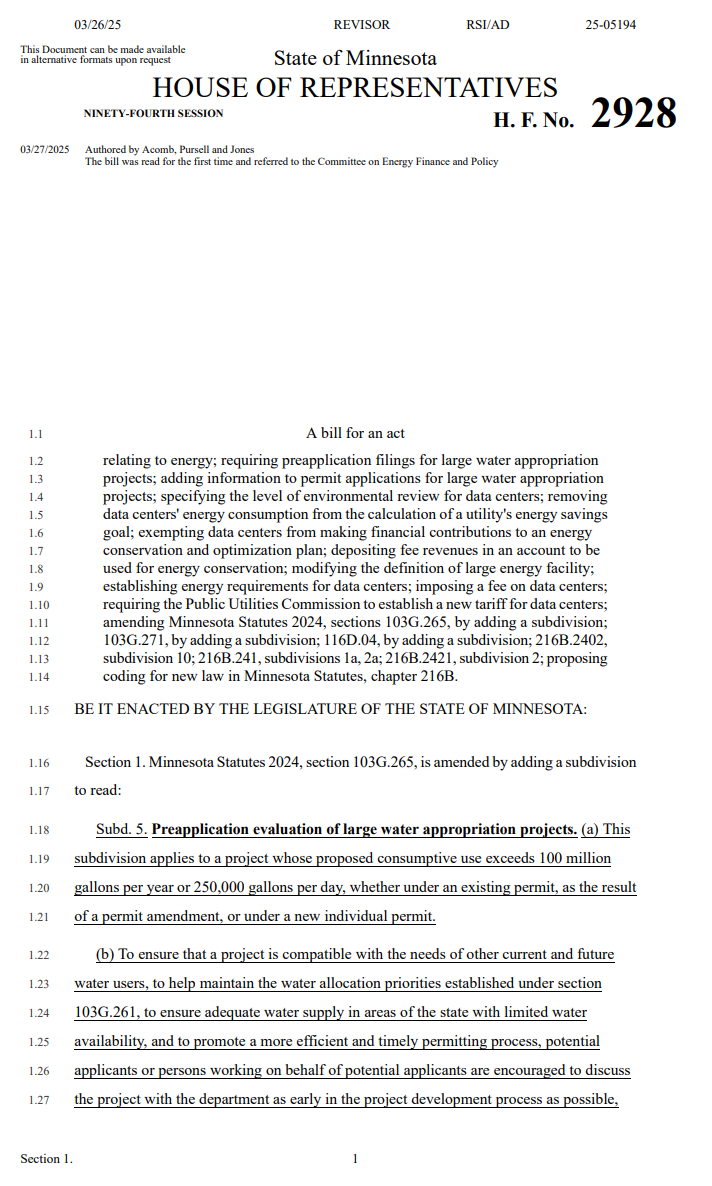 - Minnesota House hears bill requiring full environmental studies and permitting for data centers; six lawsuits pending statewide.