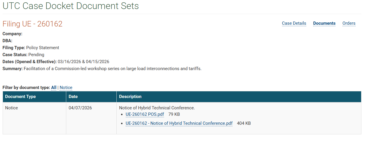 Washington's Utilities and Transportation Commission announced a workshop for April 27 to study how investor-owned utilities should handle large new power demands from data centers and other facilities. Written comments are due April 21.