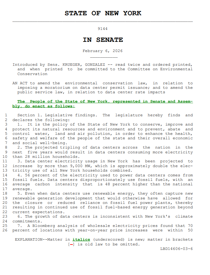 - New York Sen. Elizabeth Krueger introduces S.9144, a three-year statewide moratorium on new data center construction.