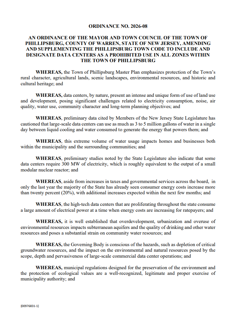 Phillipsburg's Town Council officially adopted an ordinance banning data centers in all zoning districts across the municipality. The ban (Ordinance 2026-08) received final approval on April 14.