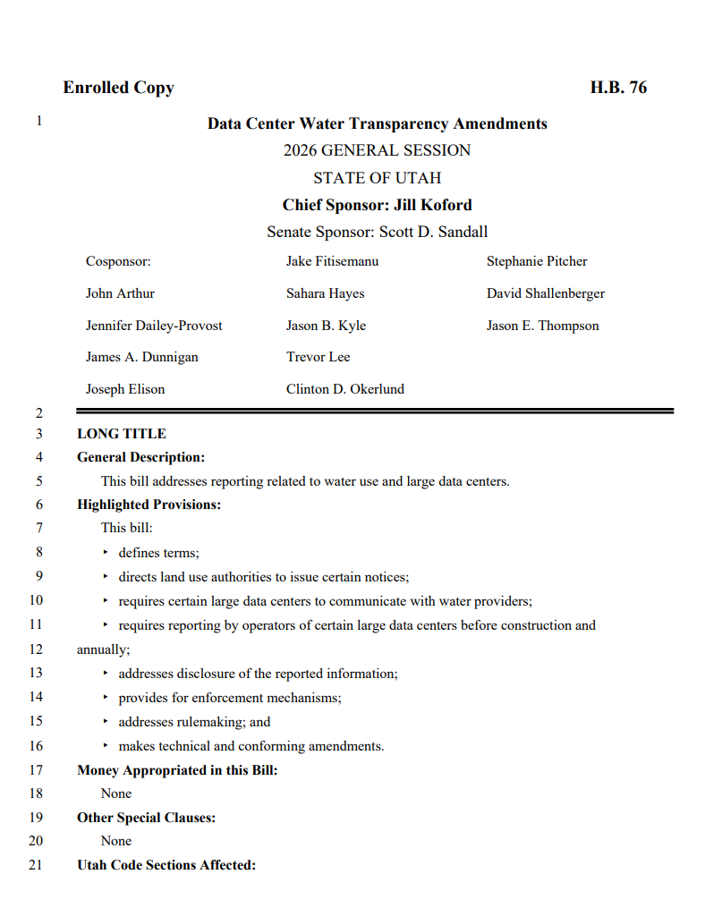 - Utah lawmakers pass the Data Center Water Transparency Amendments, requiring developers to disclose future water use estimates.