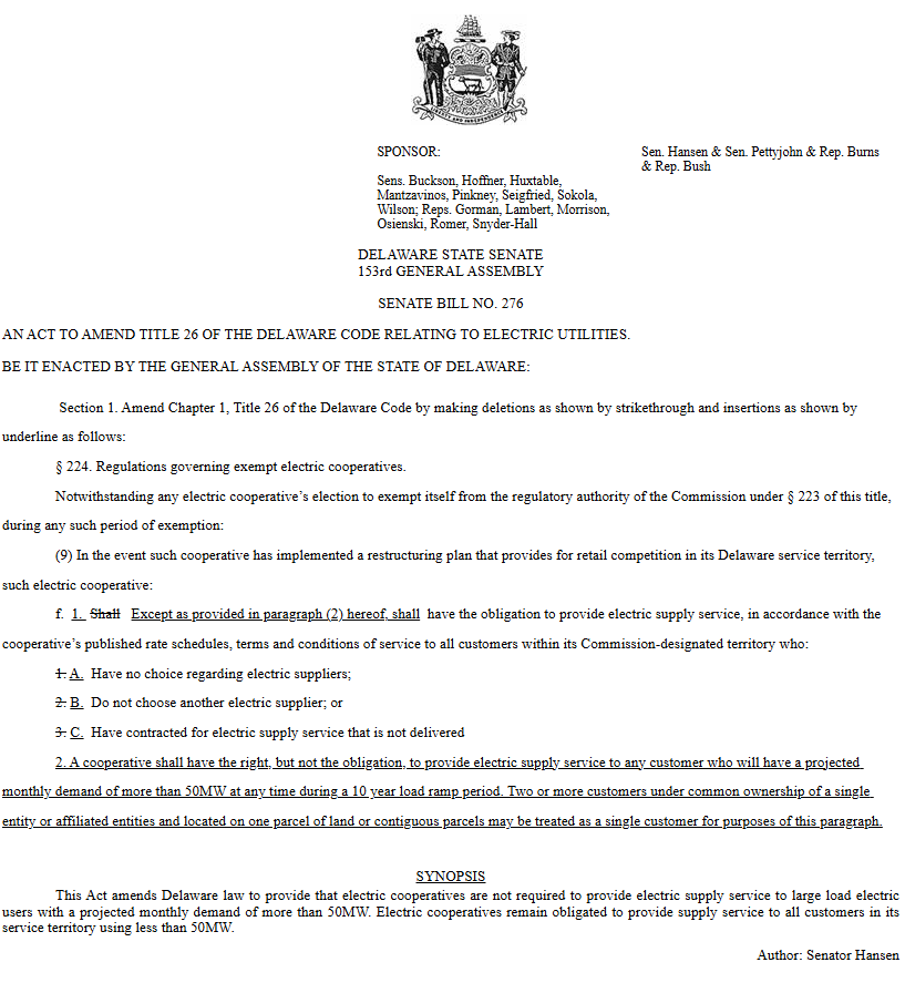 The Delaware Senate unanimously passed SB 276, which would free the Delaware Electric Cooperative from the obligation to serve facilities consuming 50 megawatts or more. That threshold is enough to power roughly 50,000 homes.