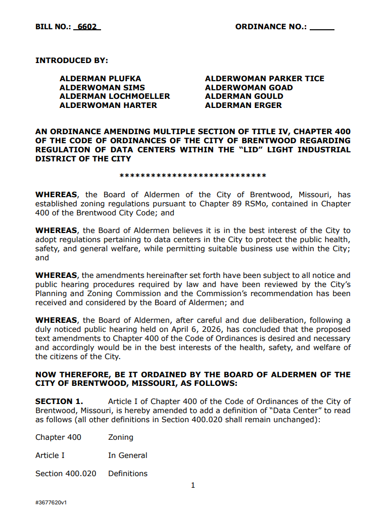 - Brentwood, MO aldermen approve ordinance classifying data centers as conditional use in light industrial zoning.