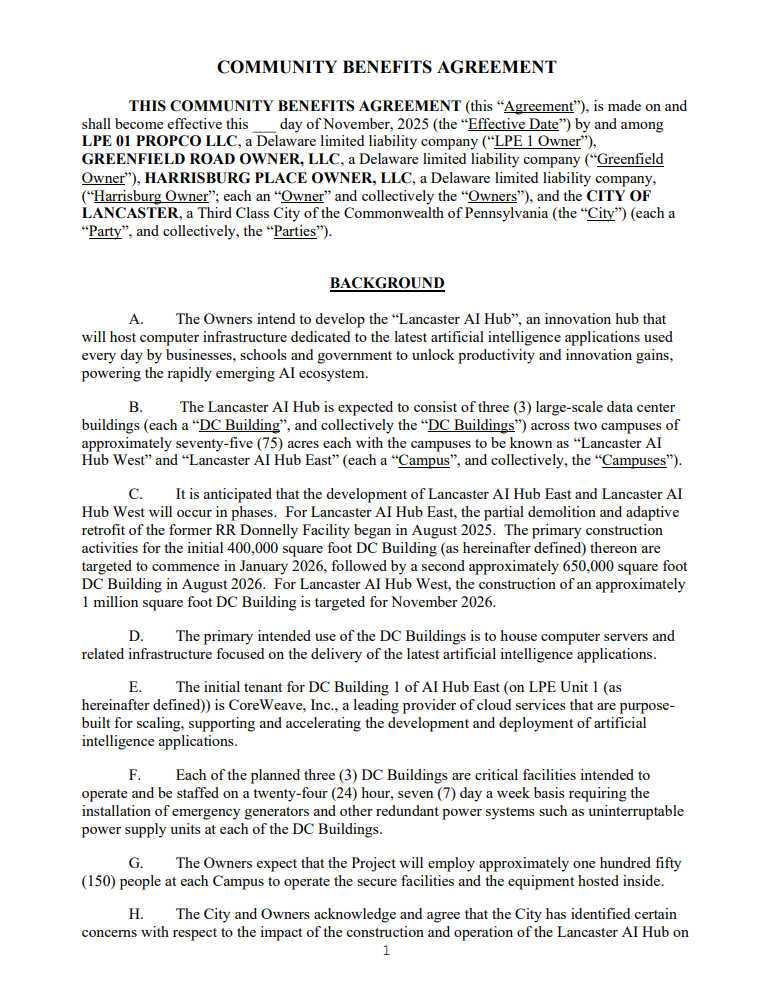 A $20 million community benefit agreement for two data center sites faces questions about enforceability and public input. Only the city can go to court to enforce the terms; residents have no direct recourse. Activist group Lancaster Stands Up asked for a seat at the negotiating table and received no response.