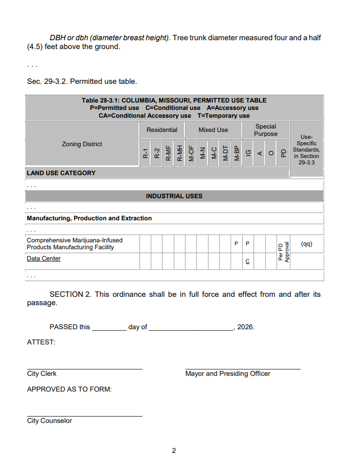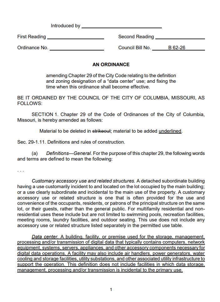 - Columbia, MO City Council votes Monday on first data center use definitions and zoning criteria.