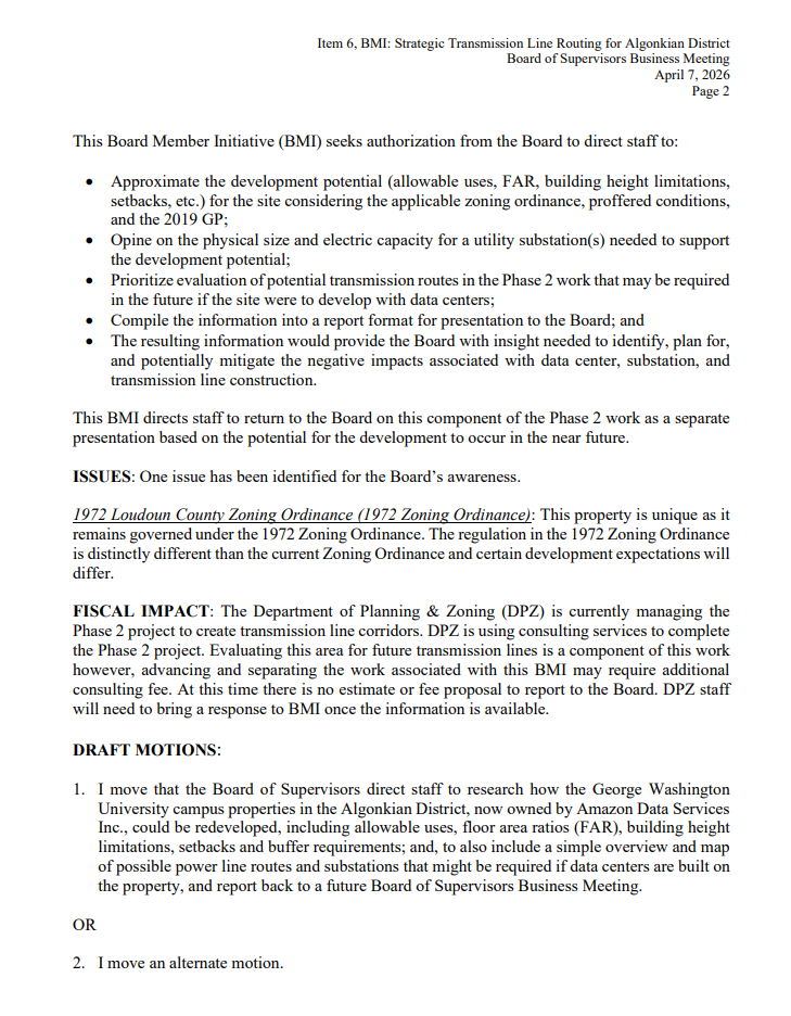 - Loudoun County, VA Board votes to investigate data center redevelopment potential on former GWU campus sold to Amazon.