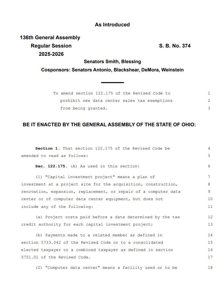 A bipartisan push in Ohio's General Assembly is targeting the state's sales-tax exemption for data centers, which cost taxpayers an estimated $140 million this fiscal year. Senators Kent Smith (D-Euclid) and Louis Blessing (R-Hamilton County) introduced SB 374 on March 11 to end the incentive for future projects. Governor DeWine vetoed a similar measure in last year's budget bill.