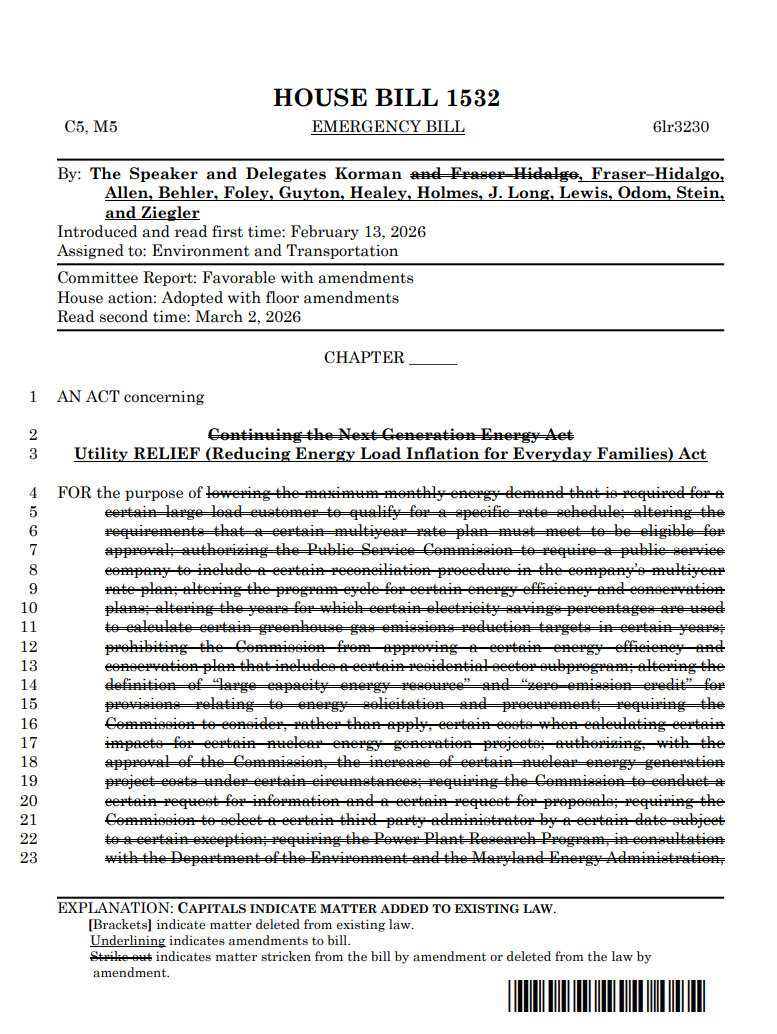The Maryland Senate passed the Utility Relief Act with provisions to manage the impact of large load users, including data centers, on the electric grid. The bill passed almost unanimously and now moves to a conference committee to reconcile with the House version.