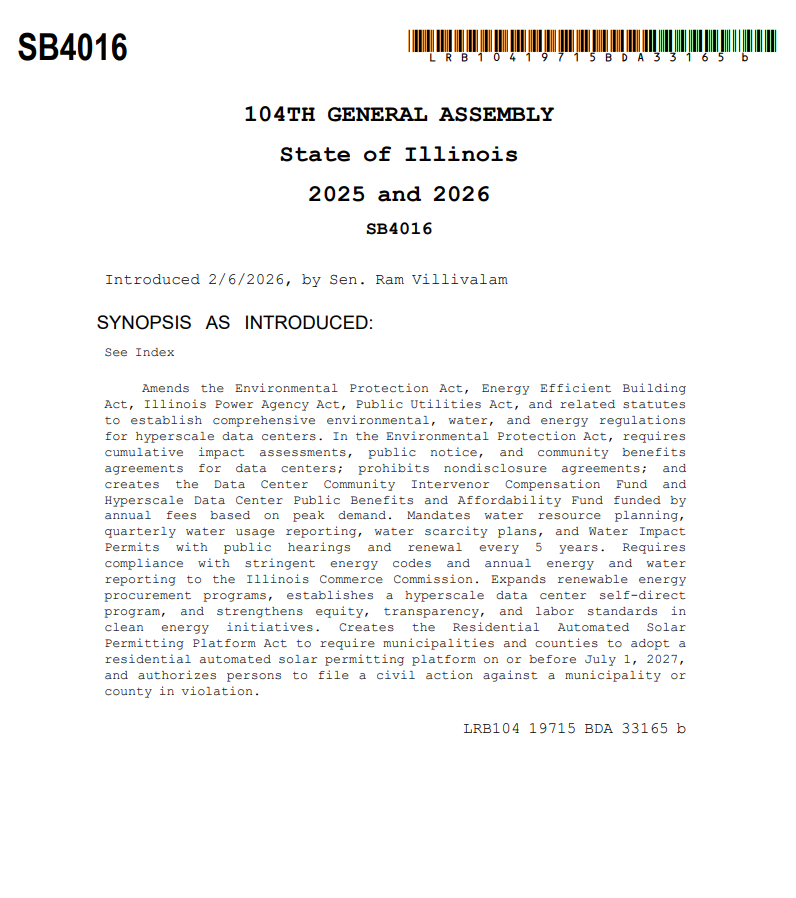 Illinois lawmakers launched the first of three planned hearings on data center regulation, with the House Executive Committee hearing from mayors, labor groups, and agriculture representatives about local impacts. The committee is considering regulations including the POWER Act. Water use, energy use, noise, and community benefit agreements were the primary topics.