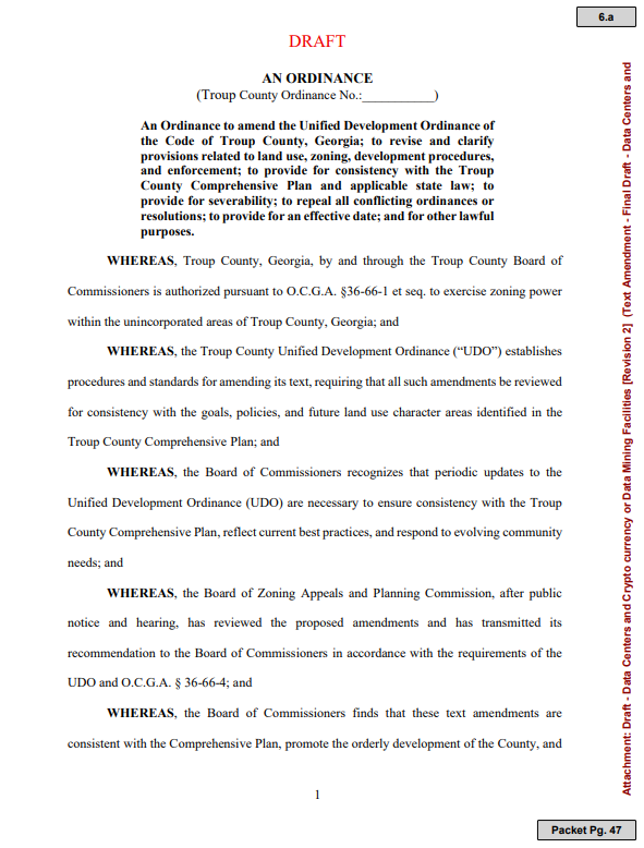 - Troup County, GA unveils draft data center ordinance for unincorporated areas during third 90-day moratorium.