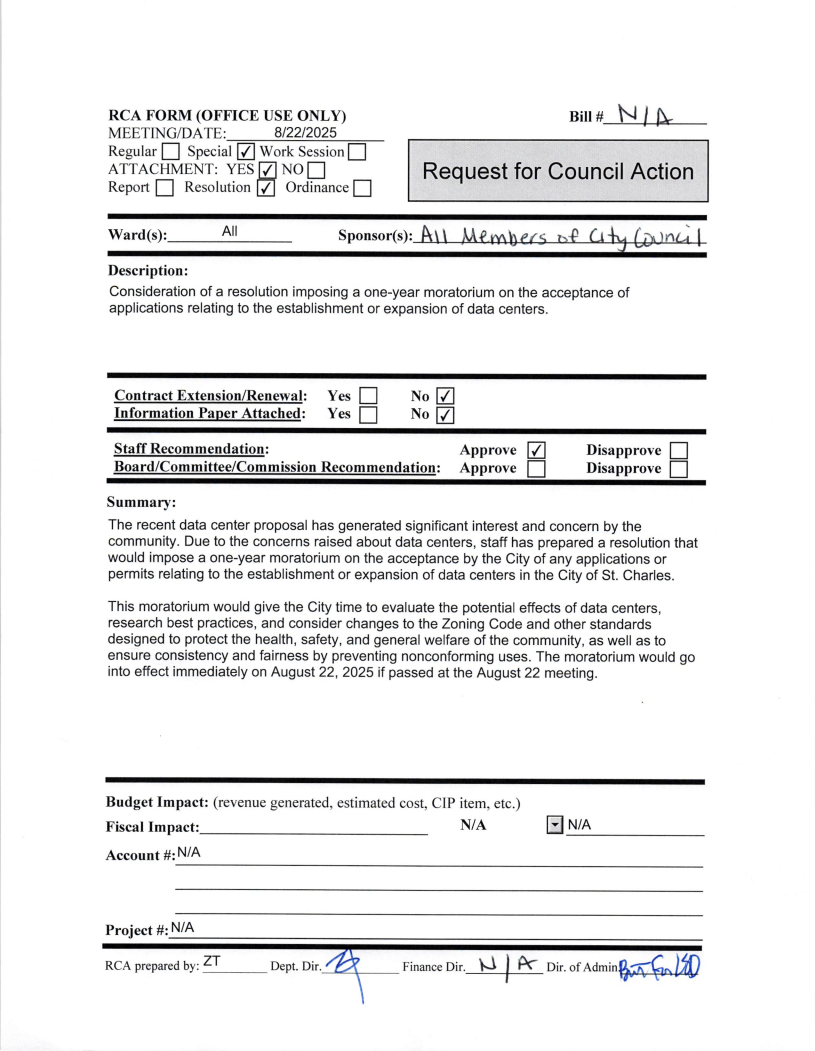 St. Charles city officials are considering a permanent ban on data centers following a yearlong moratorium that went into effect in August 2025. The moratorium, the first of its kind in the U.S., was adopted while city staff reviewed the impacts of data center development.