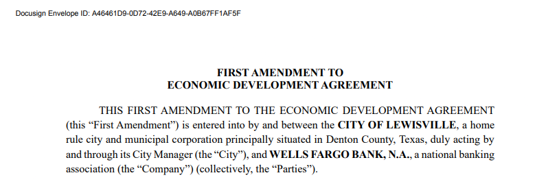 The Lewisville City Council unanimously approved a revised economic development agreement with Wells Fargo that commits an additional $100 million to a data center project at 2501 Edmonds Lane.