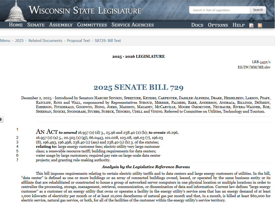 The secrecy surrounding Menomonie's $1.6 billion data center project prompted local opposition that led the city council to halt the developer's advance in January. A Democratic bill, SB 729, would classify data centers as "very large" electric power users and require utilities to file rate cases every two years.