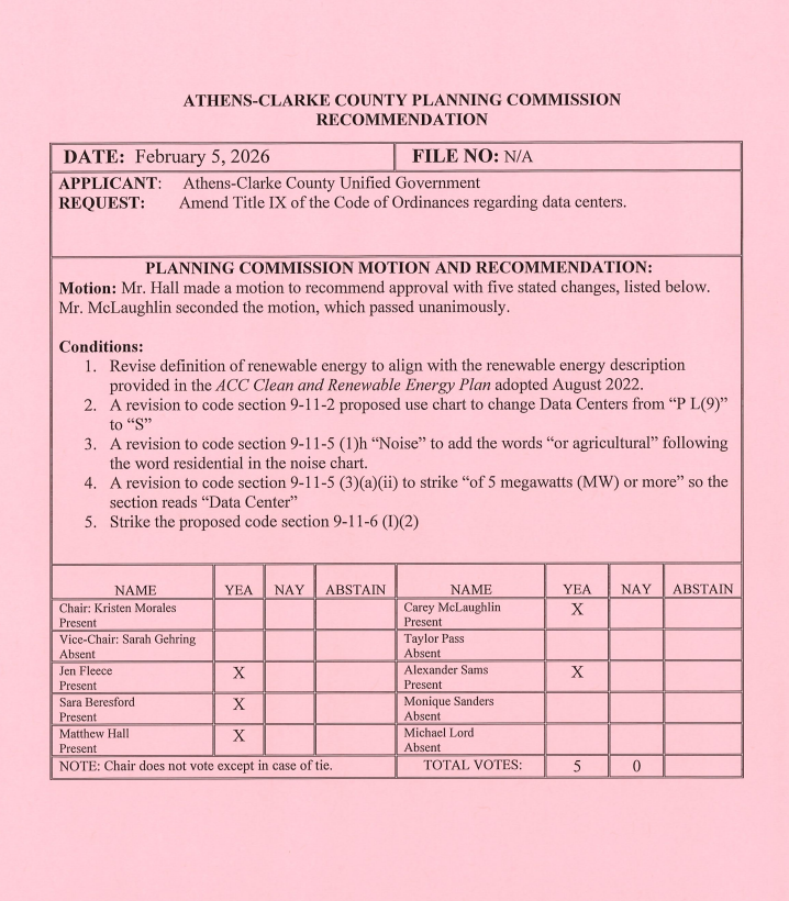 Athens-Clarke County commissioners discussed tabling zoning code changes for data centers at their Tuesday agenda-setting session, with several attendees pushing to extend the existing moratorium adopted in December 2025, which expires March 6.