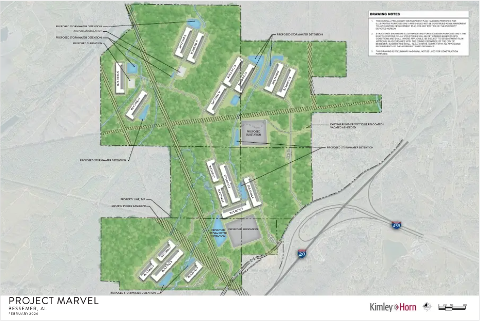 Project Marvel took its next formal step Tuesday: Bessemer's Planning and Zoning Commission voted to recommend rezoning an additional 914 acres from agricultural to light industrial use, following the expanded campus plan we covered on Feb. 10. The revised layout spreads 18 data center buildings across roughly 1,600 acres with residential setbacks increasing to 250-300 feet and buildings positioned outside the Northern Beltline corridor route.