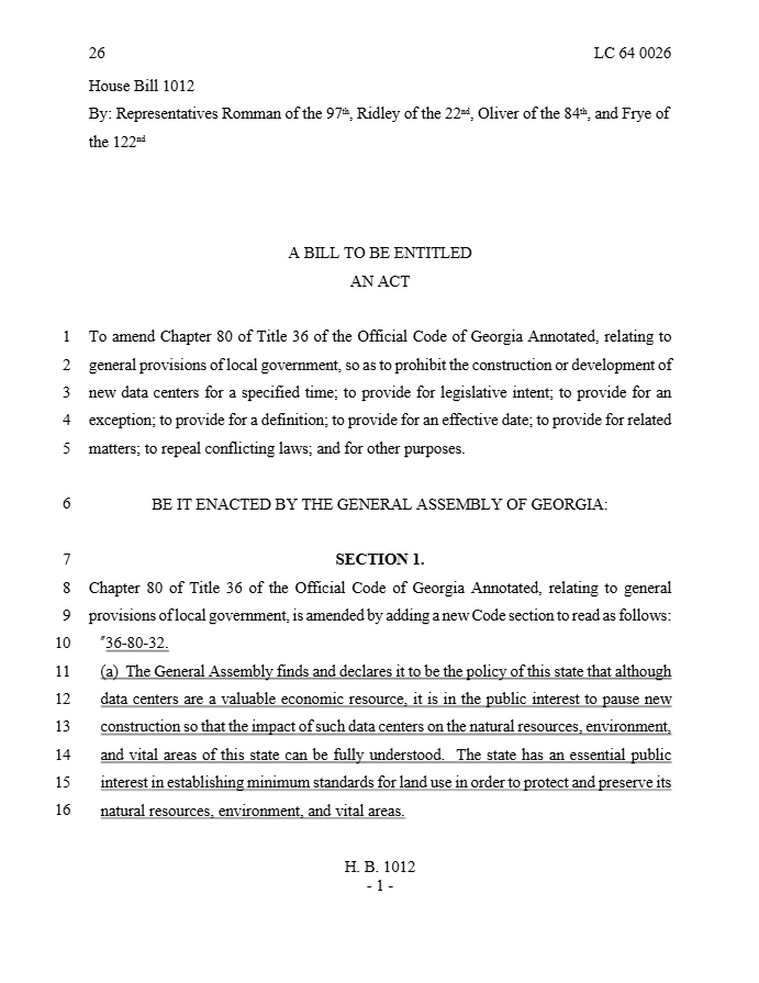 State Rep. Ruwa Romman's House Bill 1012 would halt all new construction until March 2027. The moratorium comes after the Public Service Commission approved 10,000 megawatts of new electricity capacity in December, with data centers accounting for majority of that demand. Separately, Sen. Bernie Sanders also proposed a national moratorium for data centers the same month.