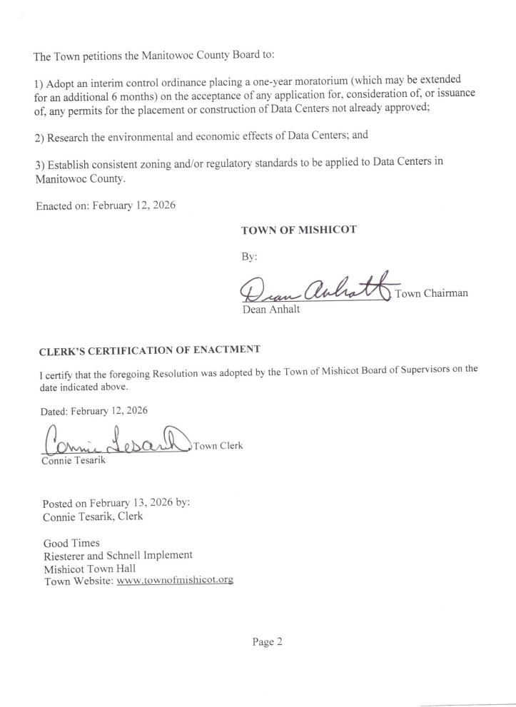 - Manitowoc County, WI planning commission unanimously advances a one-year data center moratorium to county board.