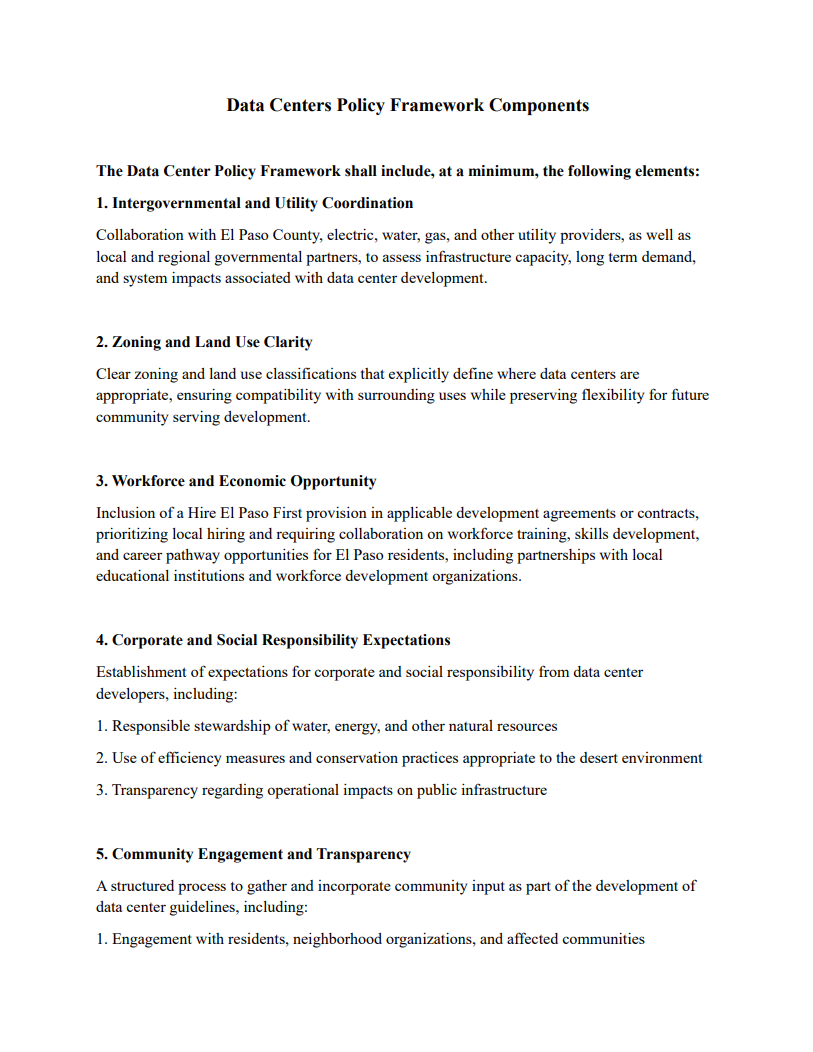 El Paso City Council will discuss a comprehensive data center policy framework during their Tuesday meeting, authorizing the city manager to develop guidelines and return within 60 days with a proposal.